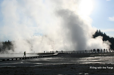 Then after stopping at Black Sand Basin, we pulled into the Old Faithful area. There we toured the Yellowstone Lodge and Visitor Center. That was a full day of checking out springs, pools, and geysers. Our legs were sore and we were ready for our campfire.